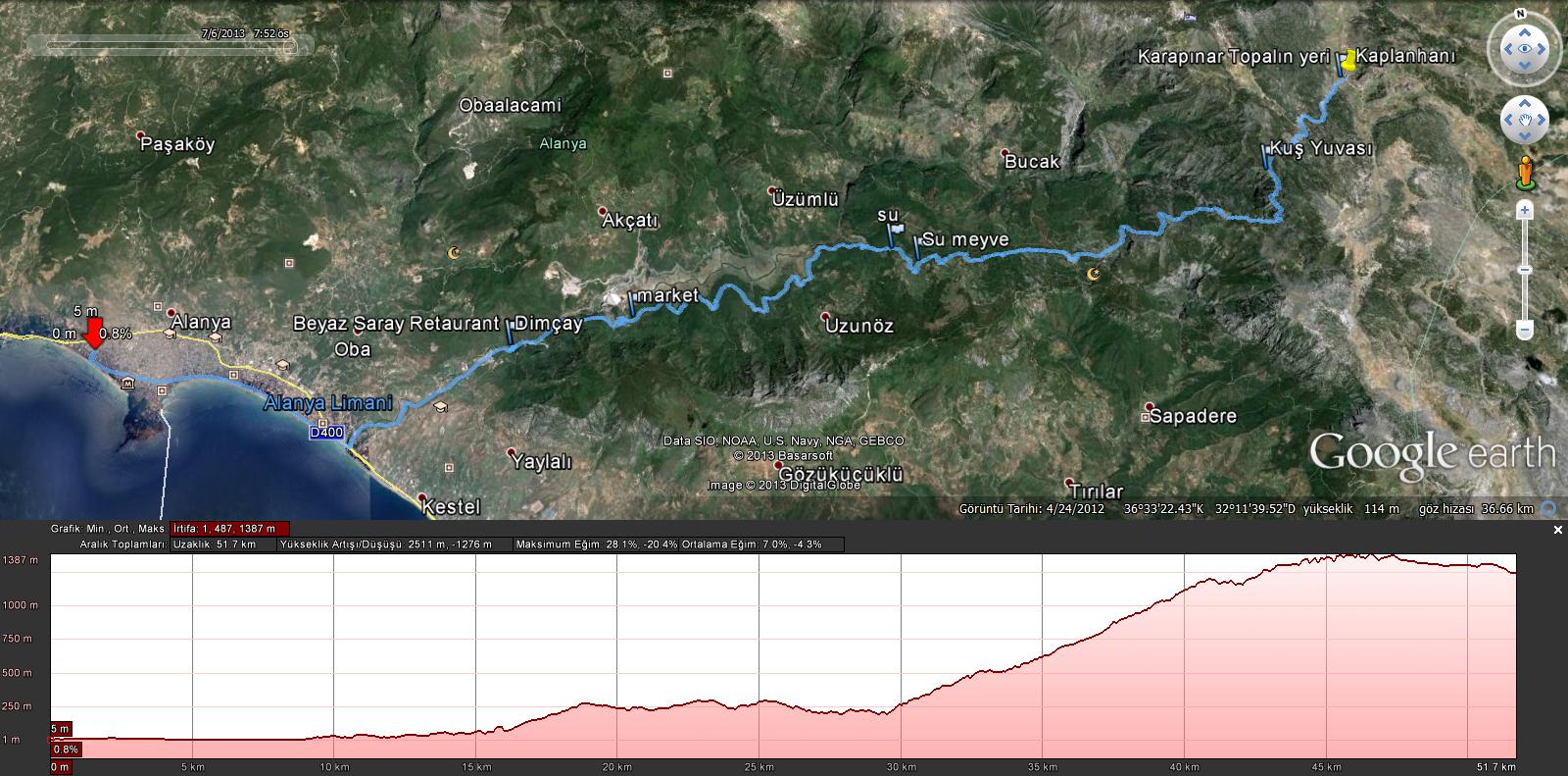 Alanya Otogarından öğle saatlerinde hareket ederek Dim Çayı kıyısından Kuş Yuvası Rampasına doğru pedallamaya başlıyoruz. Aslında bu yol için tam 1 gün planlamıştık ve 1 günün sonunda Karapınar'da olmayı hedefliyorduk. Fakat rampanın zorlu olacağını düşünerek, günden kar edelim düşüncesiyle 1 gün önceden başladığımız turumuza, gün sonunda nerede isek orada kamp atar ertesi gün tırmanmaya devam ederiz diye koyulmuştuk yollara. Fakat öyle keyifli ve eğlenceyle çıkmaya başladık ki, rampalar su gibi akıp gidiyordu tekerimizin altından. Beklediğimizin üstünde bir performansla tırmanışa devam ediyorduk. Hiç beklemediğimiz bir şekilde yarım günde Kuş Yuvasına ulaşmış ve en zorlu bölümü geride bırakmıştık. Zaten geç başladığımız için gün batmadan kamp atacak bir yer bulabilmek adına fazla oyalanmadan Karapınar'a ulaşmak üzere devam ediyoruz yolumuza. Kaplanhanı mevkiinde Topalın Yeri'nde kampımızı atıyor ve nefis ev yemekleri ile akşam yemeğimizi yedikten sonra, serin havada uyumanın keyfi ile 1. günü geride bırakıyoruz...